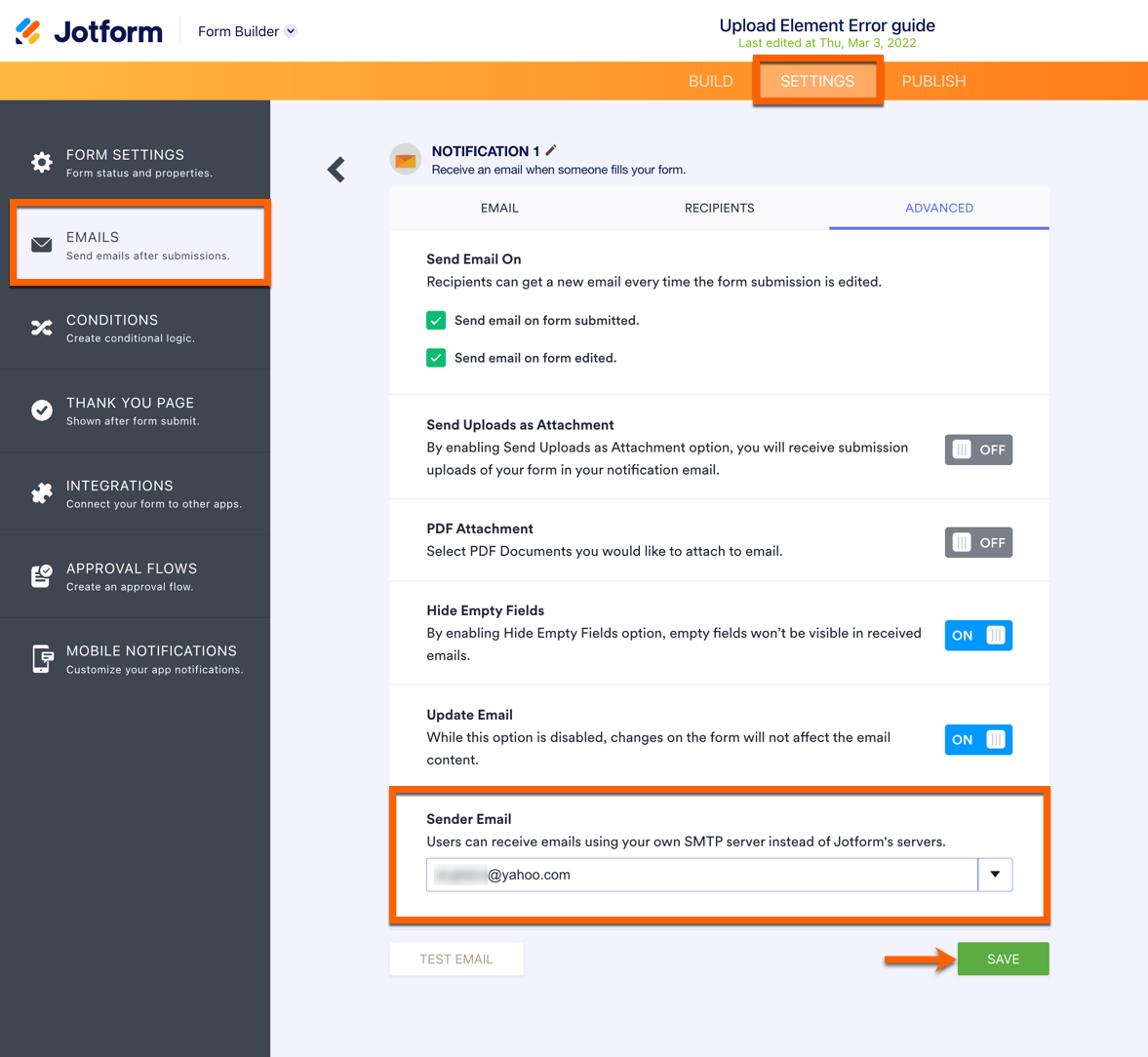 - Anda telah selesai dengan pengaturan email pengirim kustom. Sekarang, pilih email pengirim kustom yang baru untuk digunakan dalam pengaturan Email di formulir Anda.