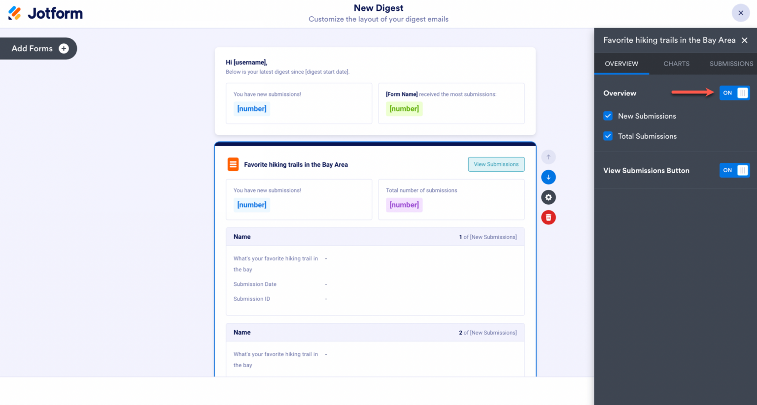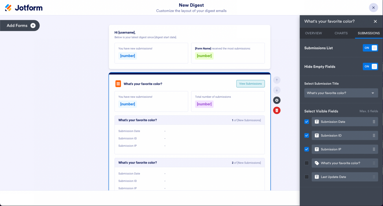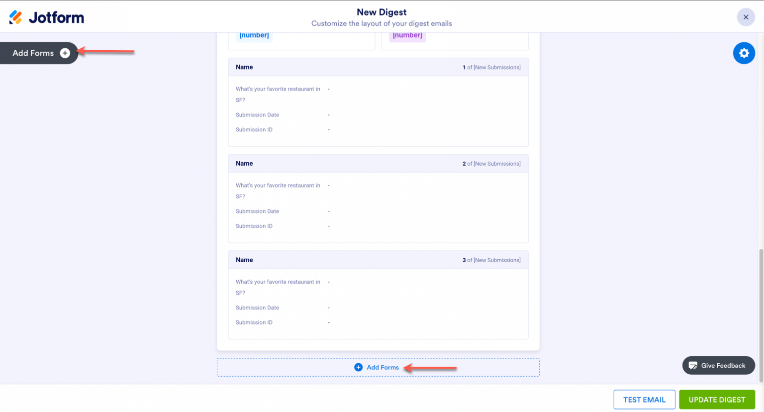 Jika Anda ingin menambahkan formulir lain ke email intisari Anda, ada dua cara untuk melakukannya, yang pertama adalah dengan mengklik tombol tambahkan formulir di sisi kiri pembuat intisari. Yang kedua adalah menggulir ke bagian bawah halaman dan klik Tambah Formulir di bagian bawah.