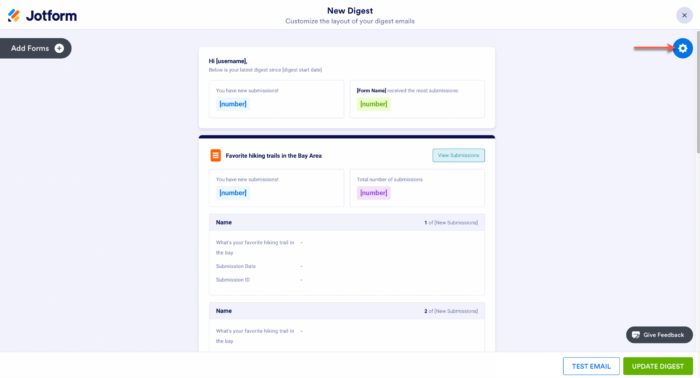 Klik roda gigi di sebelah kanan untuk membuka pengaturan Email Intisari. Pengaturan intisari di sebelah kanan sebagian besar untuk menyesuaikan pengaturan email itu sendiri, belum tentu elemen di dalam email.