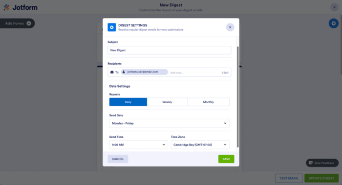 Di Pengaturan Intisari, Anda dapat menyesuaikan pengaturan subjek, tanggal, dan waktu. Anda juga dapat memilih siapa yang dapat menerima email intisari. Namun ingat, Anda hanya dapat mengirim email intisari hingga sepuluh penerima, dan jika Anda menggunakan paket pemula, Anda hanya dapat mengirim email intisari ke satu orang.