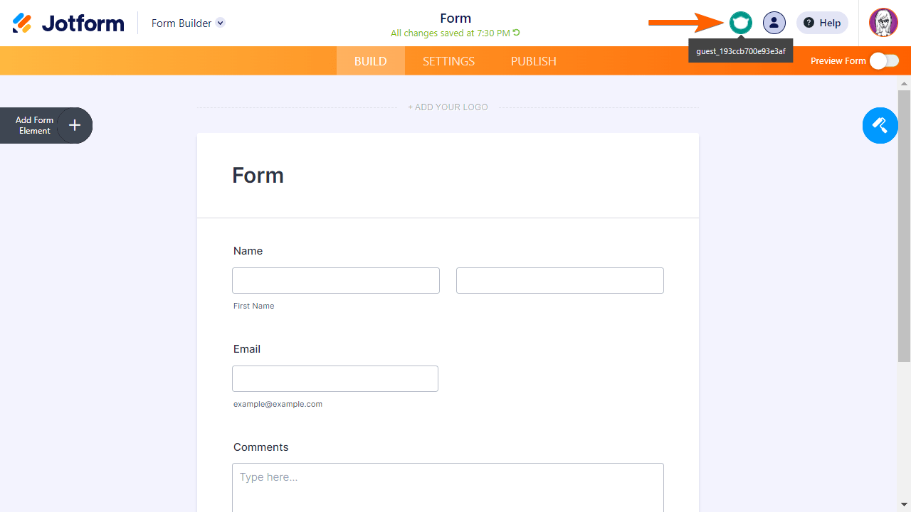 Ada petunjuk visual yang membantu ketika seseorang berhasil bergabung dalam kolaborasi. Avatar masing-masing mereka akan muncul di ujung kanan atas. Bila orang yang mendapat Tautan Kolaborasi tidak memiliki akun Jotform, mereka akan ditampilkan sebagai tamu.