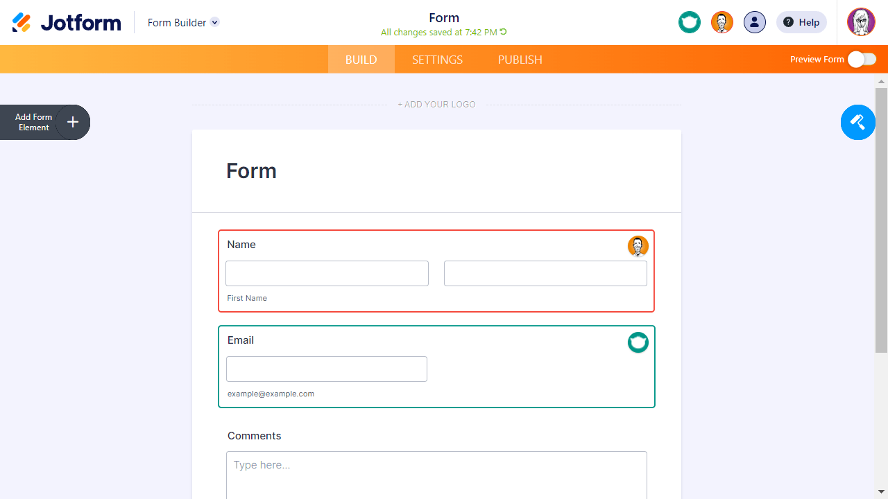 Salah satu hal baru yang menarik di Jotform V4 adalah Kolaborasi Formulir. Ini adalah pengalaman tanpa batas waktu nyata di mana beberapa anggota tim dapat bekerja secara bersamaan pada formulir yang sama. Semua perubahan diunggah secara otomatis sehingga Anda selalu mengedit versi terbaru.