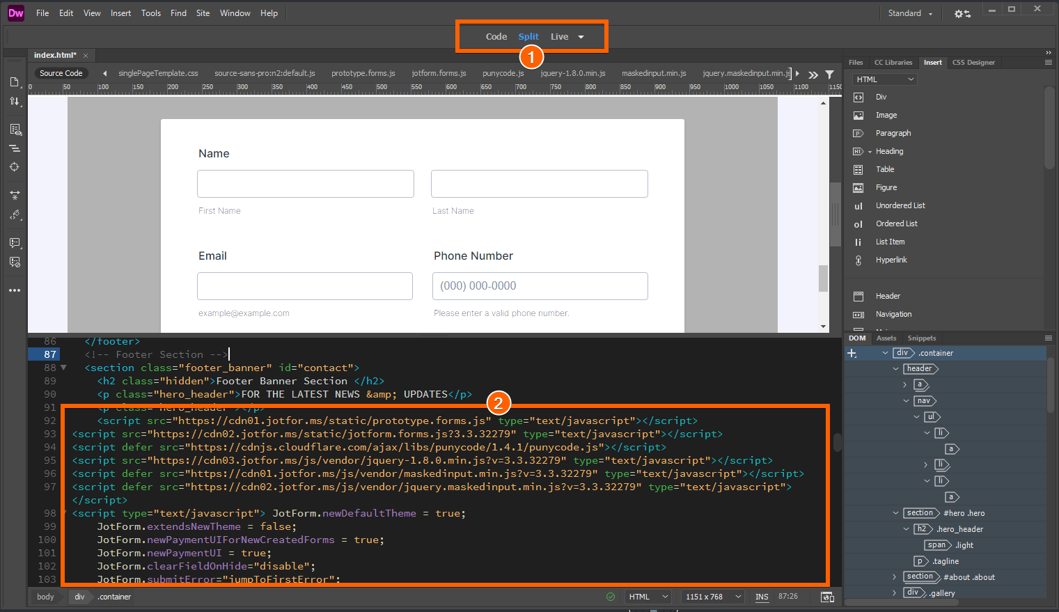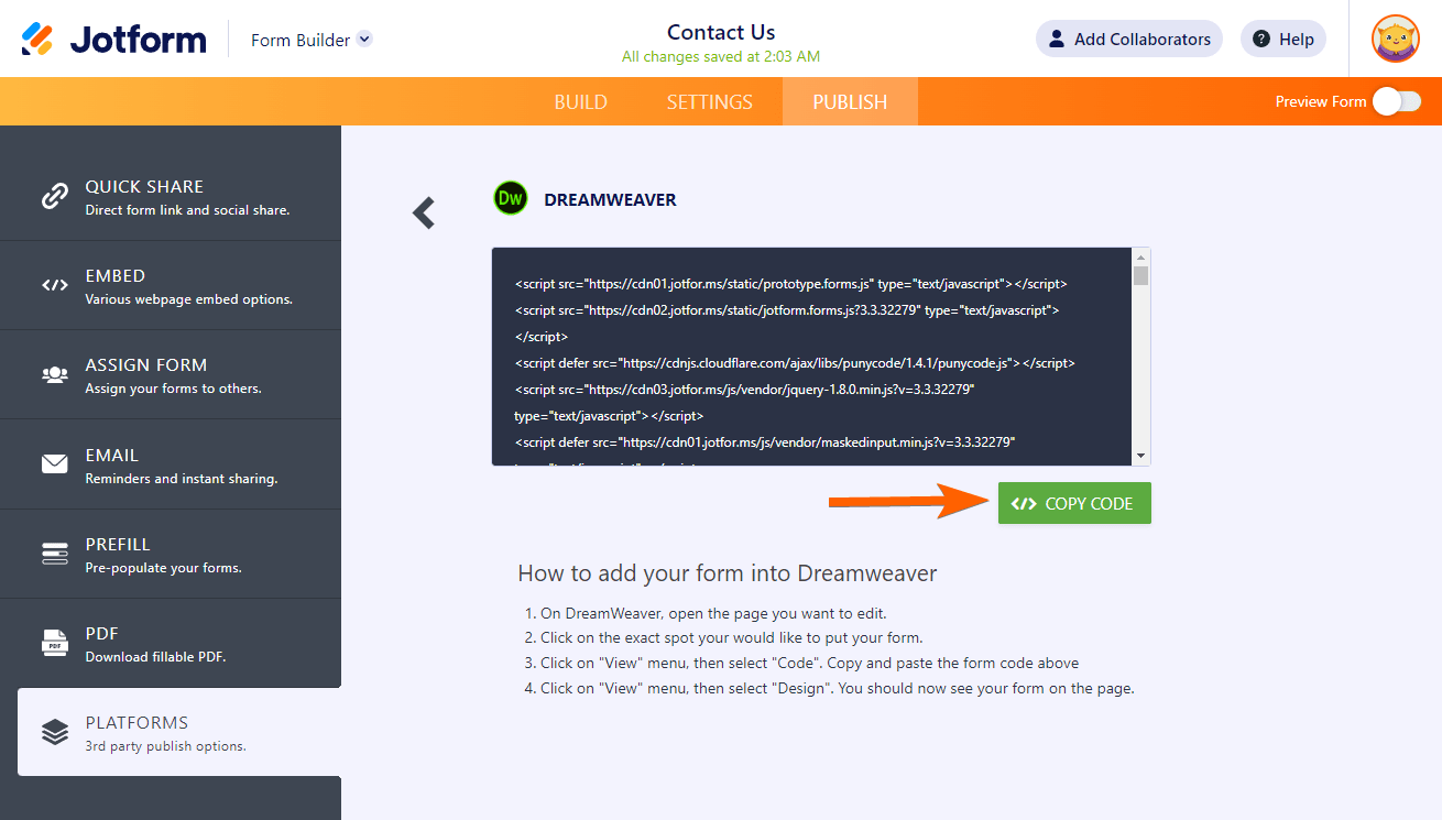 Adobe Dreamweaver adalah alat desktop yang membantu Anda membuat dan menerbitkan halaman web dengan cepat. Dreamweaver mendukung HTML, CSS, JavaScript, dan banyak lagi. Jika Anda membangun situs web denga Dreamweaver dan ingin menyematkan formulir Jotform Anda, silakan tonton video singkat berikut atau lihat langkah di bawah ini: