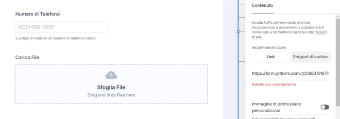 Quando hai finito di configurare il modulo, passa alla scheda Pubblica. La prima pagina contiene un link per incorporare il modulo in un sito web. Copialo e torna su Squarespace.