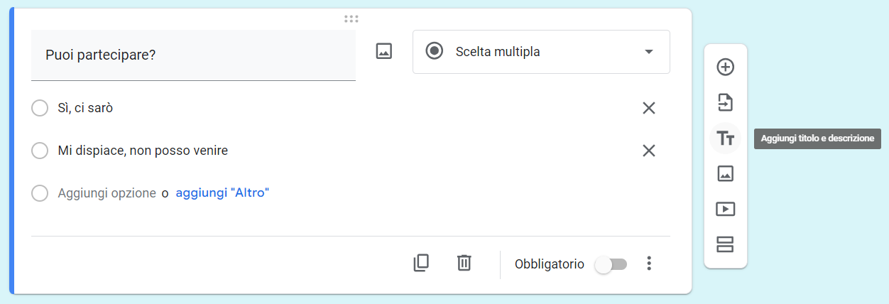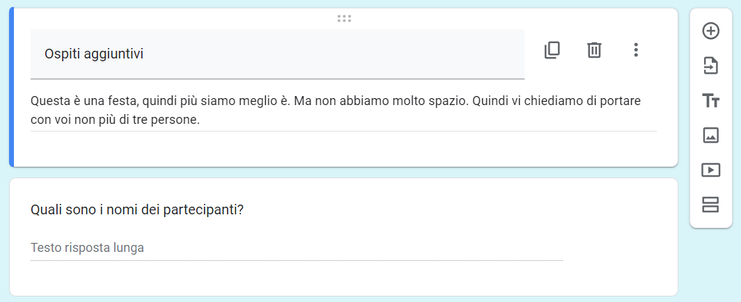 Per ogni domanda che aggiungi in Moduli Google, vedrai alcune opzioni di personalizzazione nella barra degli strumenti a destra. Puoi raggruppare le domande in sezioni e aggiungere titoli e descrizioni per fornire maggiori informazioni su ciò che stai chiedendo. Puoi anche aggiungere foto e video, utili soprattutto per i quiz.