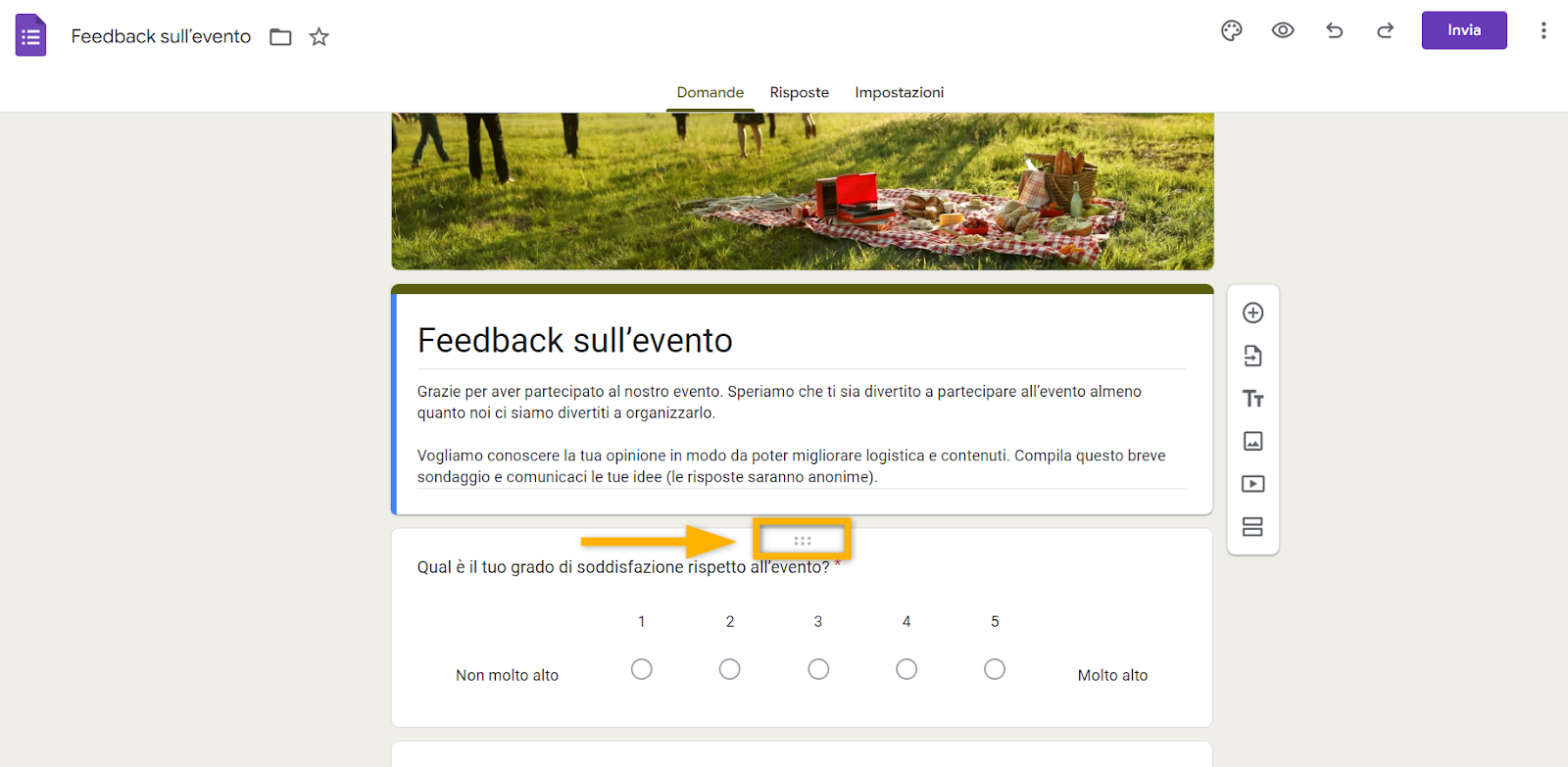 Se hai già aggiunto le tue domande e desideri cambiarne l’ordine, basta cliccare e trascinarle. Posiziona il cursore sui sei puntini in alto nella casella della domanda, poi clicca e trascina la domanda nella nuova posizione.