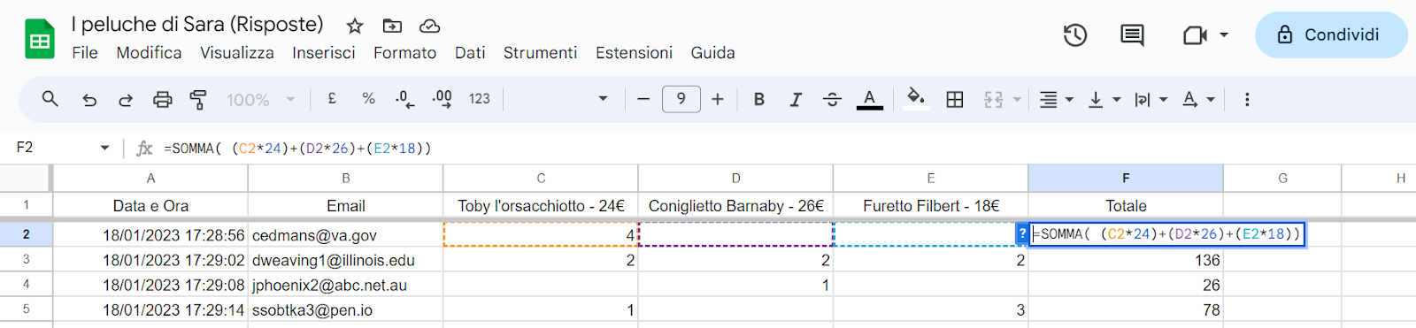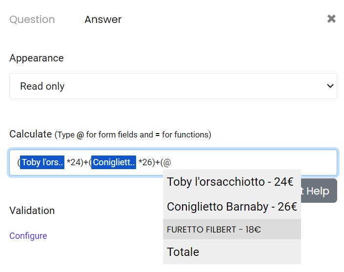 Ma cosa succede se desideri effettuare calcoli sui valori dalle risposte ricevute tramite il modulo? Potresti voler calcolare i punteggi di un quiz. Oppure magari desideri mostrare ai tuoi clienti un prezzo totale per gli articoli che desiderano acquistare.