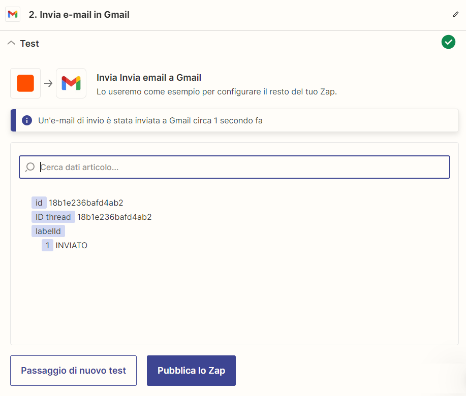 Completa i passaggi della sezione relativa all’email e prova il tuo Zap. Se tutto sembra corretto, pubblica il tuo Zap.