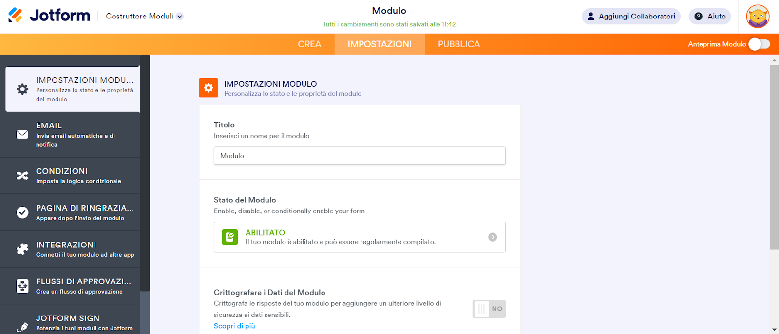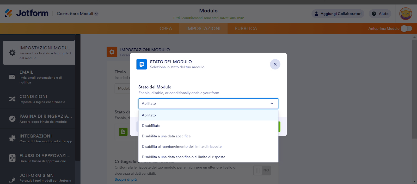 - Il menù a tendina Stato del Modulo offre diverse opzioni, tra cui “Disabilita a una data specifica” e “Disabilita al raggiungimeto del limite di risposte”.