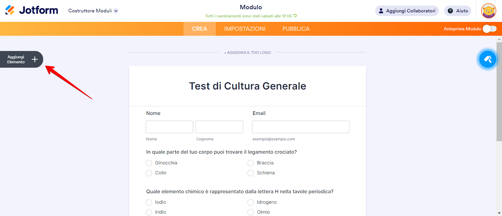 - Clicca su Aggiungi Elemento in alto a sinistra.