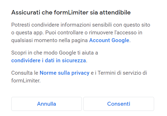 - Riceverai una notifica che ti chiederà se ti fidi di formLimiter. Clicca su Consenti.