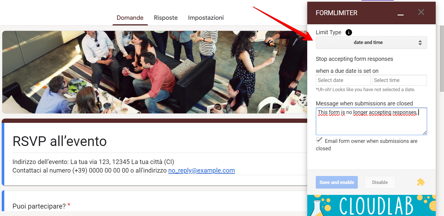 Con Moduli Google, è possibile ottenere questo risultato impostando un limite di tempo e, una volta raggiunto, il modulo smetterà automaticamente di accettare risposte.