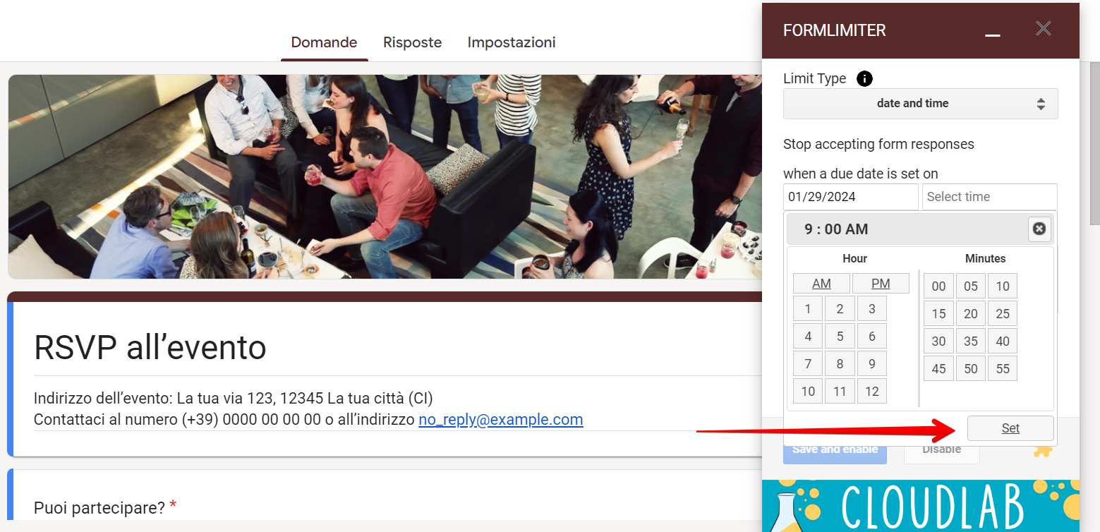 - Seleziona la data e l’ora di scadenza per la disattivazione del modulo e clicca su Imposta.