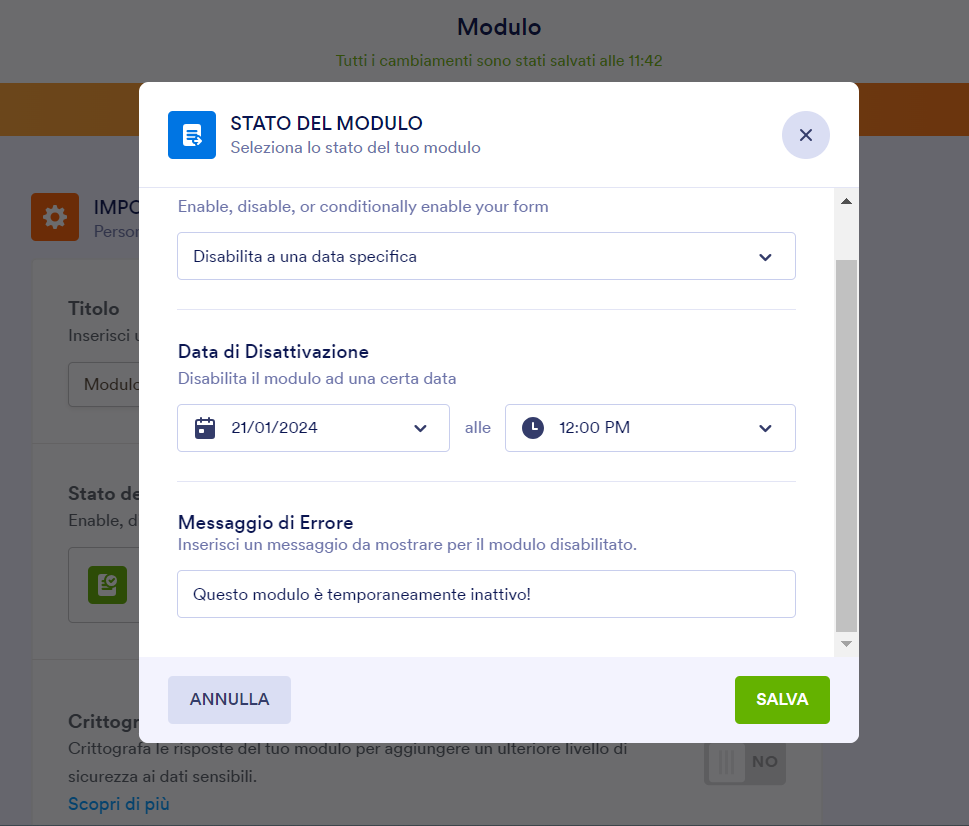 Il modulo verrà disattivato alla data e all’ora impostate.