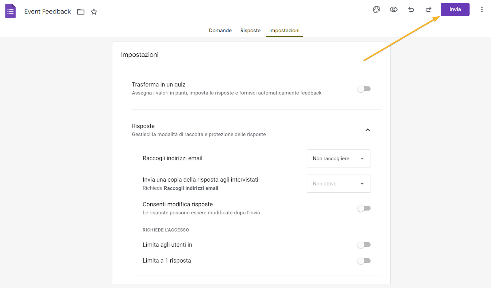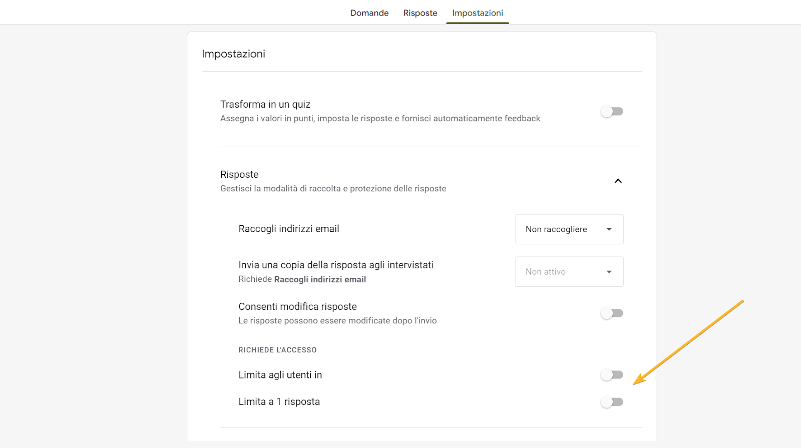 - Nella sezione Richiede l’accesso, disattiva tutte le opzioni, incluso Limita a 1 risposta.