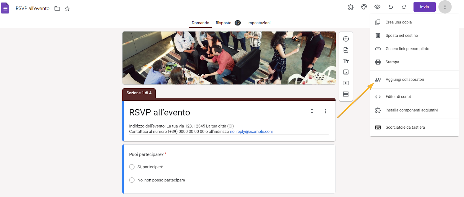Come accennato in precedenza, se condividi il tuo modulo Google tramite un link o lo incorpori nel tuo sito web, permetti ai partecipanti di compilarlo senza però poterlo modificare. Gli unici modi per permettere ai destinatari di apportare modifiche al tuo modulo Google sono