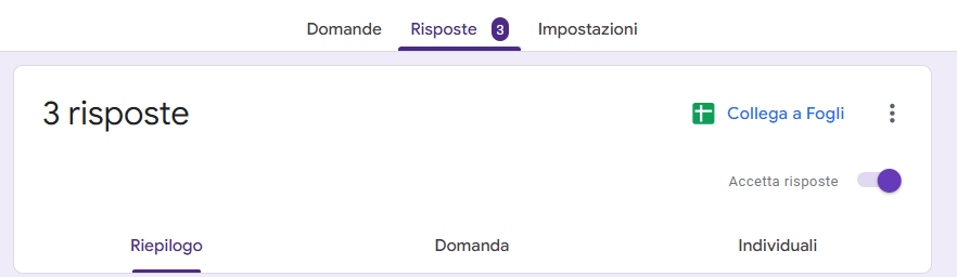Moduli Google ti offre una panoramica piacevole, leggera e in stile analitico delle risposte ai moduli. Per vederla, vai alla scheda Risposte nella parte superiore, la scheda secondaria Riepilogo dovrebbe essere già selezionata.