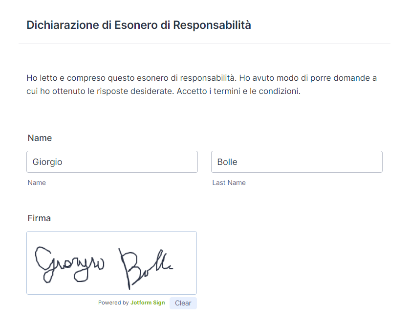 È possibile collegare un codice QR a qualsiasi modulo Jotform esistente, ad un nuovo modulo creato da zero o ad uno dei nostri migliaia di modelli già pronti. Il modulo di rinuncia qui sotto include un campo per permettere ai clienti di apporre la loro firma elettronica. (Puoi aggiungere questo elemento a qualsiasi modulo cliccando sul campo Firma nel menù Elementi del Modulo o trascinandolo nella posizione desiderata).