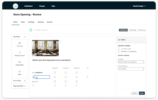 Il punto in cui Sogolytics scarseggia è nella logica di visualizzazione: puoi mostrare o nascondere solo domande basate sulla domanda precedente, non su una matrice o una raccolta di domande. Inoltre, una volta aggiunta la logica a una domanda, non puoi spostarla, il che potrebbe costringerti a rielaborare il sondaggio.