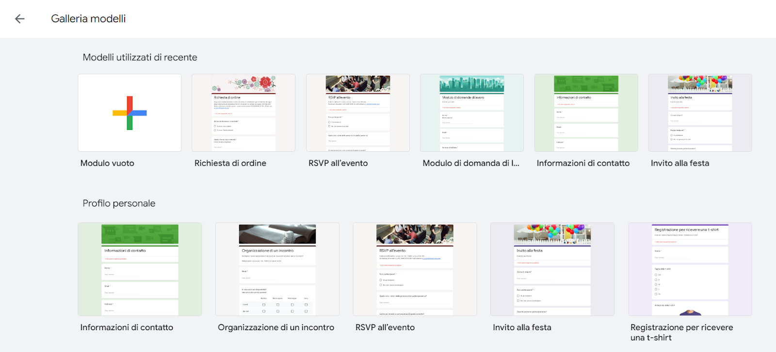 Da qualsiasi prodotto Google, clicca sull’icona della griglia in alto a destra e seleziona Moduli Google nella libreria delle app. Clicca sulla Galleria modelli e sfoglia l’elenco dei moduli nelle sezioni Lavoro, Istruzione e Profilo personale per selezionare quello che più ti piace.