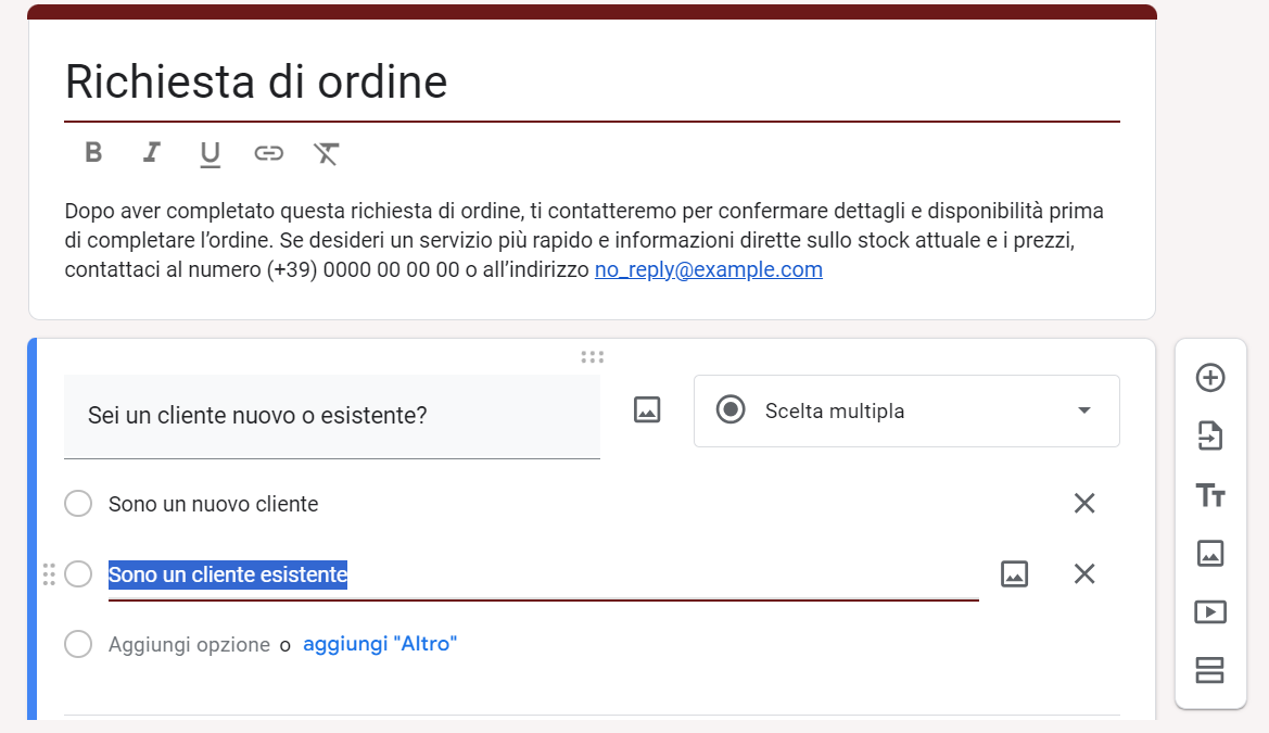 Clicca sui testi presenti nel modello per modificarli. Puoi cambiare il titolo e la descrizione del modulo, le domande e le varie opzioni di risposta per ognuna di esse.