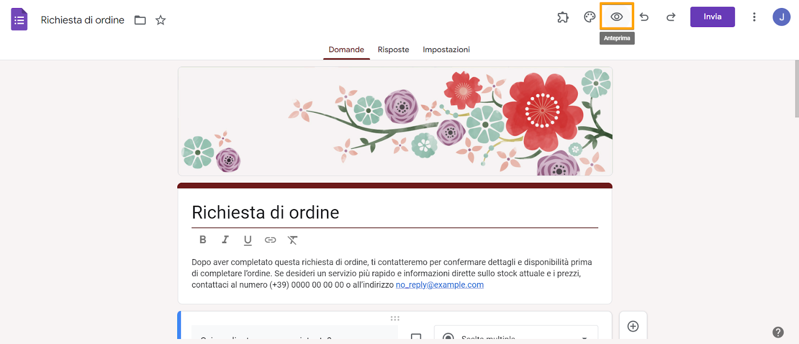 Clicca sull’icona a forma di occhio (nella barra degli strumenti in alto) per visualizzare l’anteprima del modulo e l’aspetto che il modulo avrà una volta pubblicato.