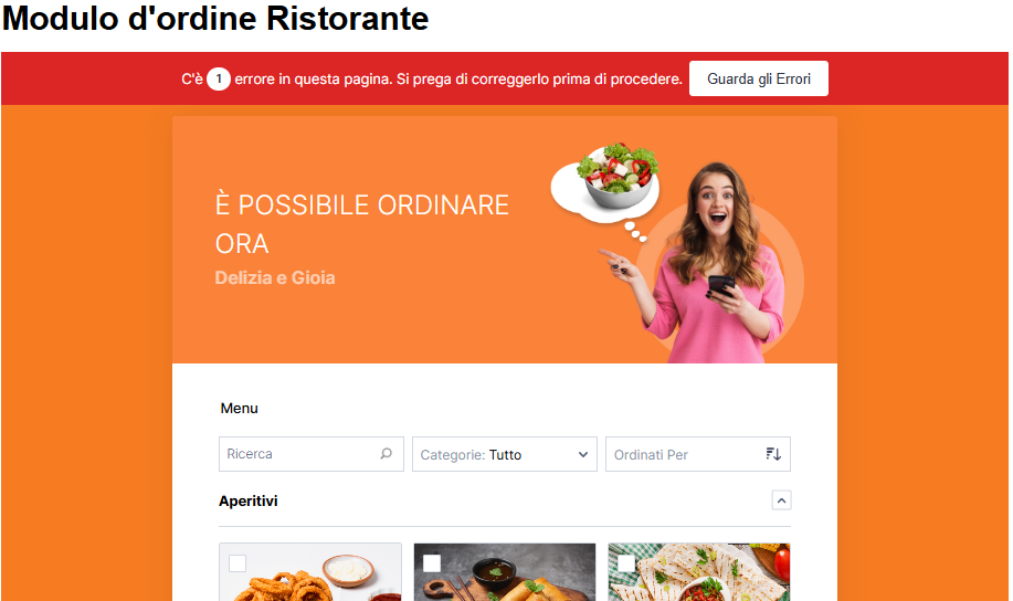 Come esempio di come impostare un modulo d’ordine da utilizzare sul tuo sito WordPress, utilizziamo il modello di modulo d’ordine per ristoranti.