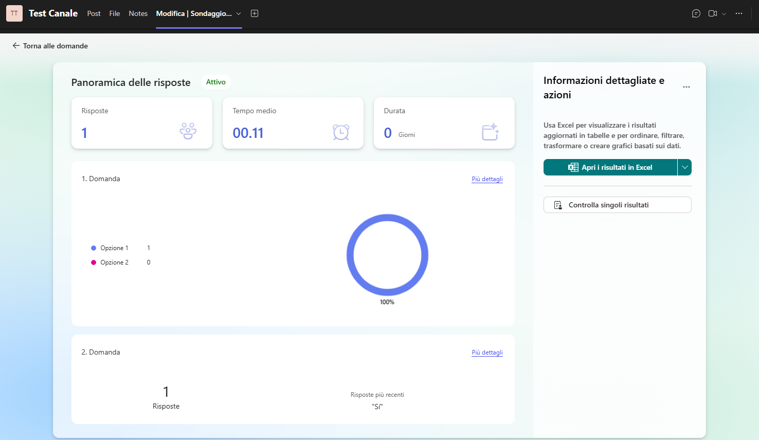 Potrai vedere quante risposte hai ricevuto, il tempo medio necessario per completare il sondaggio e se il sondaggio è ancora attivo. Puoi visualizzare le risposte direttamente in Teams o fare clic su Apri in Excel per visualizzarle in un foglio di calcolo.