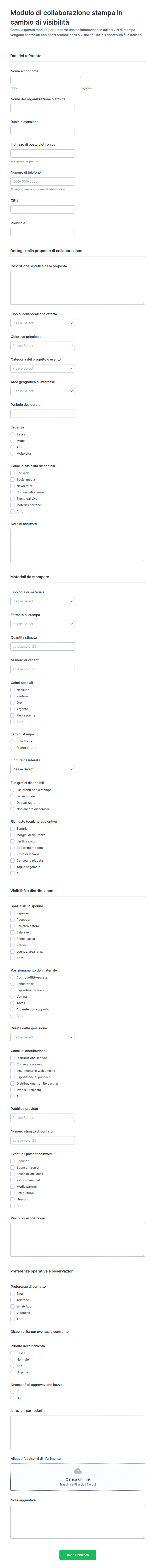• Campi di caricamento file (per documenti di supporto o immagini)