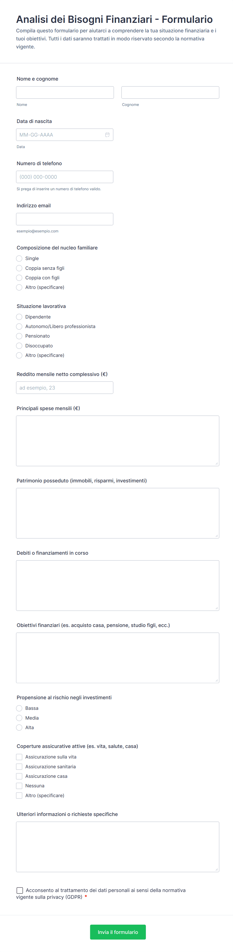 Un modulo per consulenti finanziari è un documento digitale utilizzato dai professionisti finanziari per raccogliere, organizzare e gestire le informazioni dei clienti, i profili di rischio, le preferenze di investimento, e i dati di conformità.