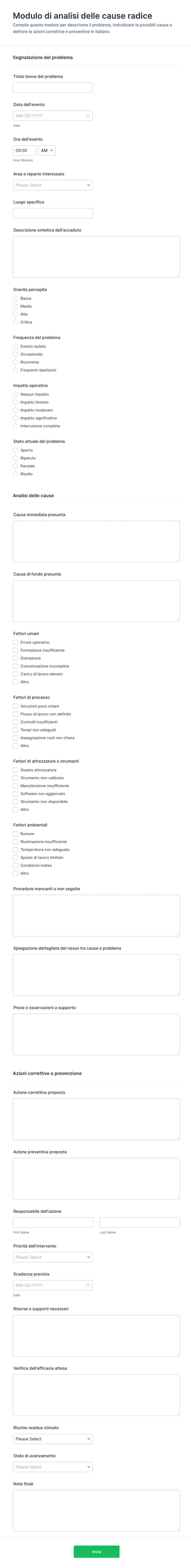 Un modulo di segnalazione incidenti è un documento strutturato utilizzato per registrare i dettagli su eventi inaspettati, incidenti o quasi incidenti in vari contesti. Aiuta le organizzazioni a documentare cosa è successo, chi è stato coinvolto e quali azioni sono state intraprese.