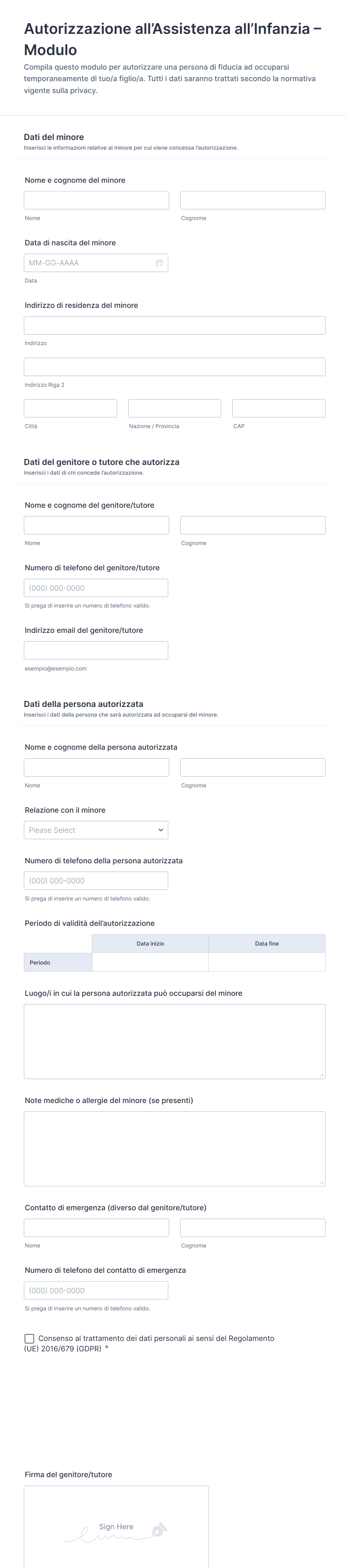 Un modulo per l'asilo è un documento digitale o cartaceo utilizzato dai fornitori di servizi di assistenza all'infanzia per raccogliere, organizzare e gestire informazioni relative ai bambini, ai genitori, al personale e alle operazioni quotidiane all'interno di un asilo.