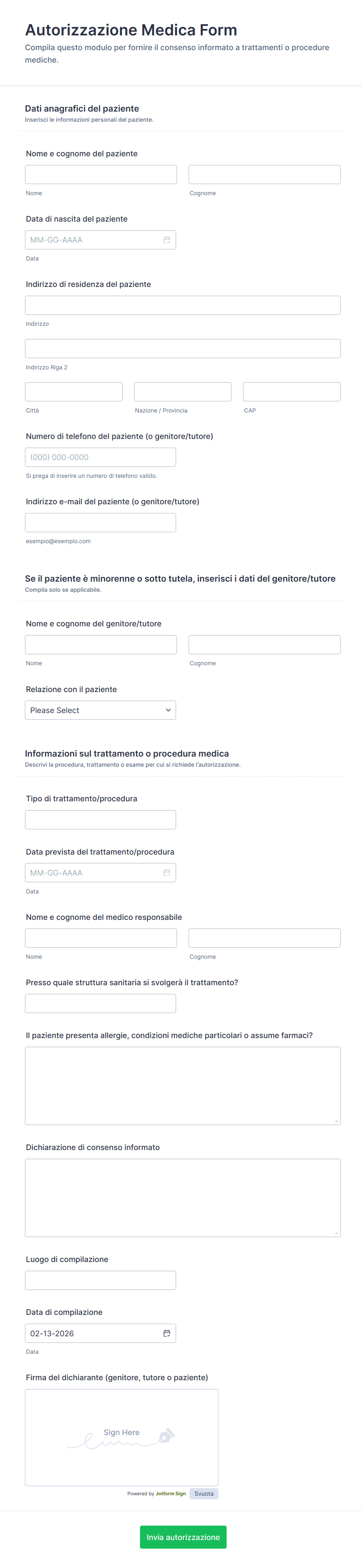 Tipicamente, il paziente firma il modulo. Per i minori o le persone incapaci di dare il consenso, deve firmare un genitore, tutore legale o rappresentante autorizzato.