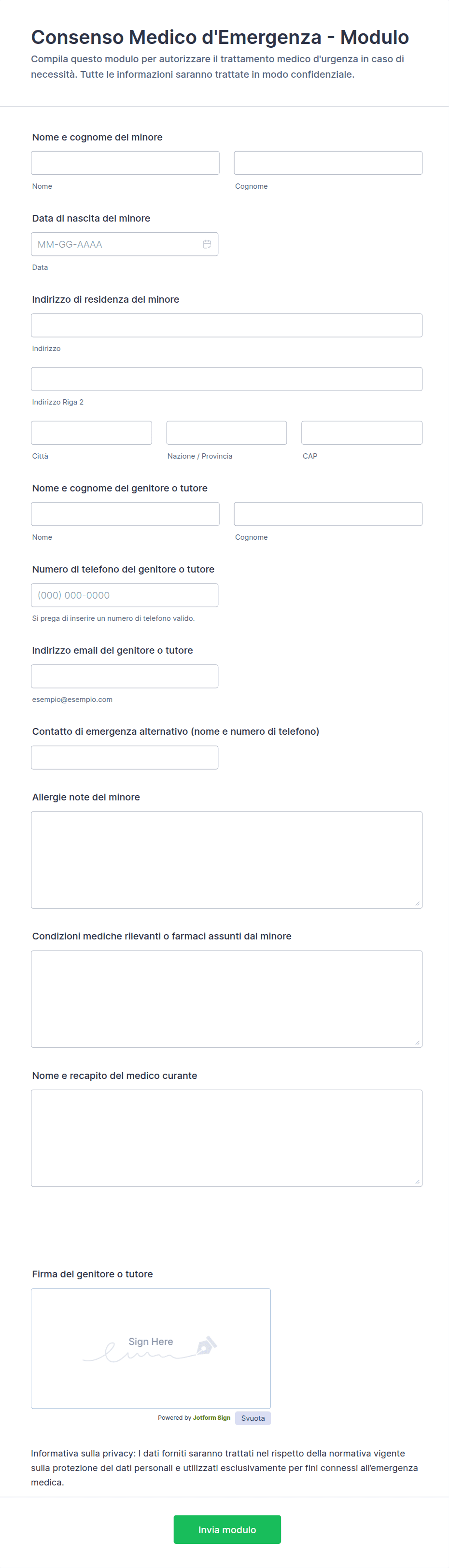 Tipicamente, il paziente firma il modulo. Per i minori o le persone incapaci di dare il consenso, deve firmare un genitore, tutore legale o rappresentante autorizzato.