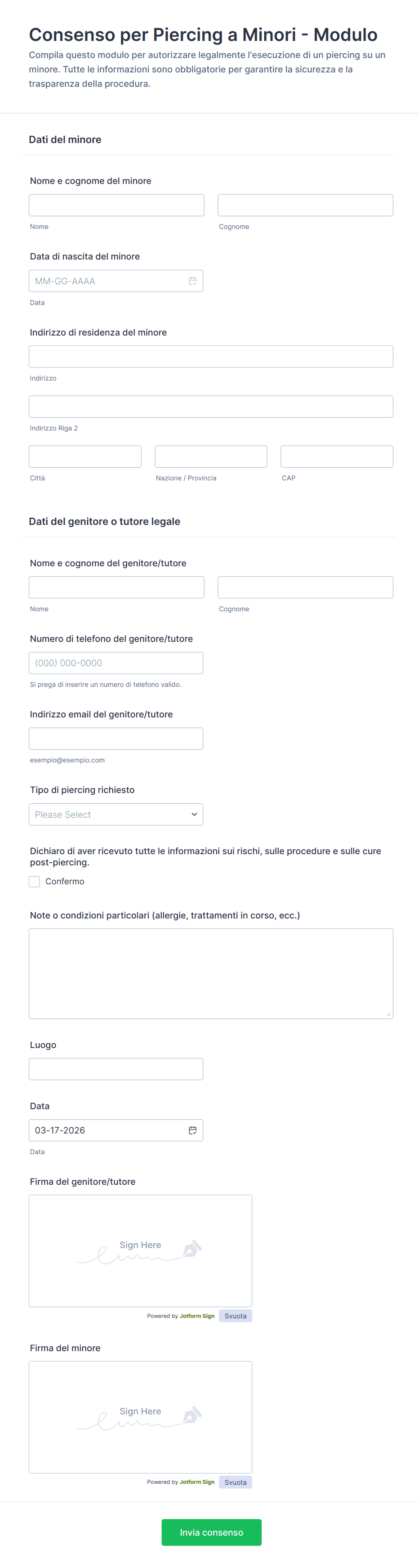Con Jotform, creare e gestire moduli di consenso informato diventa un processo fluido ed efficiente. Il Costruttore di Moduli di Jotform, che non richiede capacità di programmazione, consente agli utenti di progettare rapidamente moduli di consenso personalizzati in base alle proprie esigenze specifiche, sia per scopi sanitari, di ricerca o aziendali. Gli utenti possono sfruttare la funzionalità trascina e rilascia, integrare widget di firma elettronica e impostare la logica condizionale per garantire l'acquisizione di tutte le informazioni necessarie. I moduli inviati vengono archiviati in modo sicuro e facilmente accessibili, garantendo la conformità e la conservazione dei documenti. L'ampia libreria di modelli e le opzioni di integrazione di Jotform semplificano ulteriormente il processo, consentendo alle organizzazioni di raccogliere, gestire e proteggere i dati relativi al consenso in modo professionale e conforme.