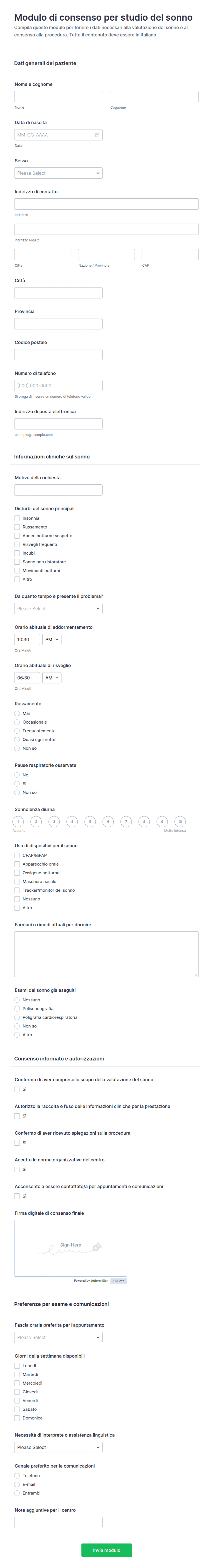 Il Modulo di consenso per studio del sonno supporta centri del sonno e ambulatori nella raccolta dati e nel consenso informato online, con firma digitale e gestione ordinata di ogni invio del modulo tramite Jotform.