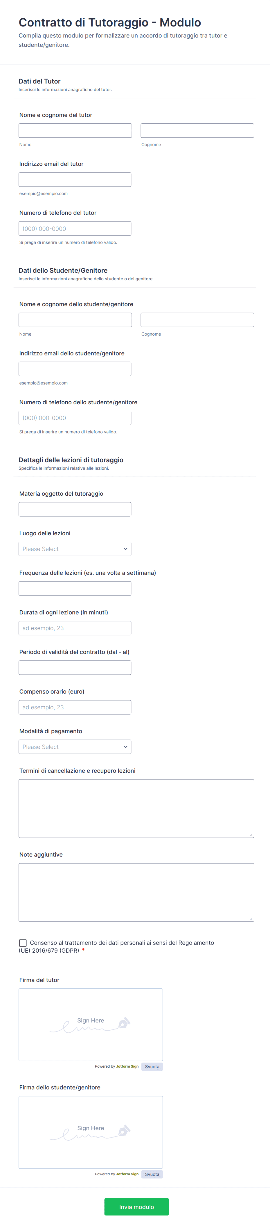Si usa per definire in modo chiaro gli accordi tra tutor e studente o genitore prima di iniziare, così da avere condizioni condivise su lezioni, compensi e regole operative, oltre a una raccolta dati ordinata.