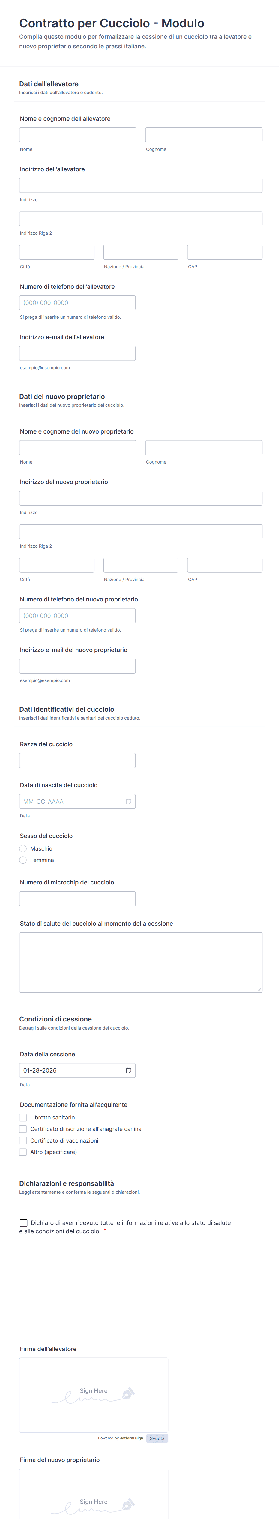 I modelli di documenti legali sono documenti pre-progettati utilizzati per facilitare una vasta gamma di processi legali, come la redazione di contratti, la raccolta di firme elettroniche, la gestione dell'acquisizione di clienti e il rispetto delle normative. Questi modelli sono essenziali per studi legali, dipartimenti legali, professionisti delle risorse umane e individui che necessitano di creare accordi giuridicamente vincolanti, esenzioni, moduli di consenso, NDA e altro ancora. Fornendo un formato strutturato, i modelli di documenti legali aiutano gli utenti a raccogliere tutte le informazioni necessarie, ridurre gli errori e semplificare il processo di documentazione per varie transazioni e procedure legali.