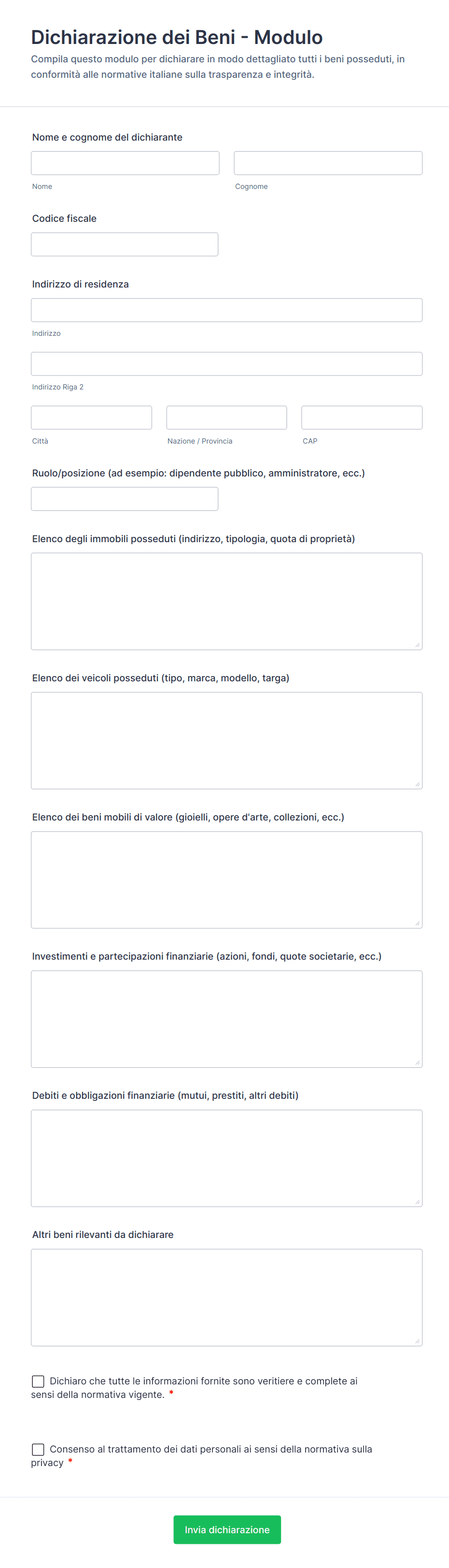 Un modulo di dichiarazione è un documento utilizzato per raccogliere dichiarazioni ufficiali, conferme o divulgazioni da individui o organizzazioni, spesso per scopi legali, sanitari o di conformità.