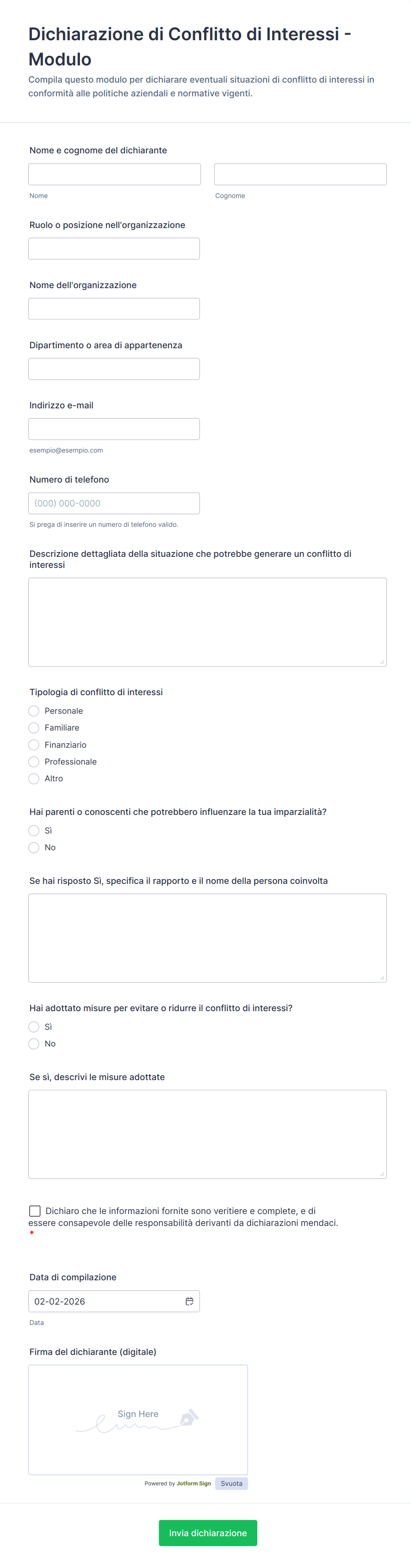 Un modulo di dichiarazione è un documento utilizzato per raccogliere dichiarazioni ufficiali, conferme o divulgazioni da individui o organizzazioni, spesso per scopi legali, sanitari o di conformità.
