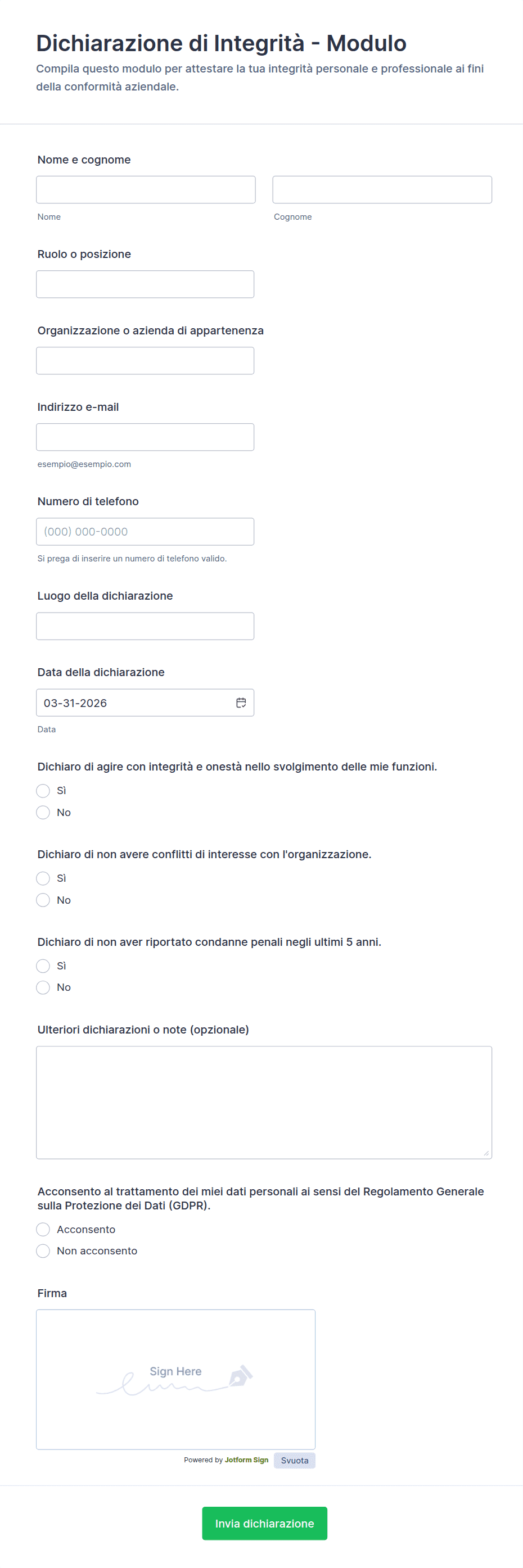 - Dichiarazioni Legali: Richiedono termini dettagliati, caselle di controllo per l'accettazione e campi per la firma elettronica.