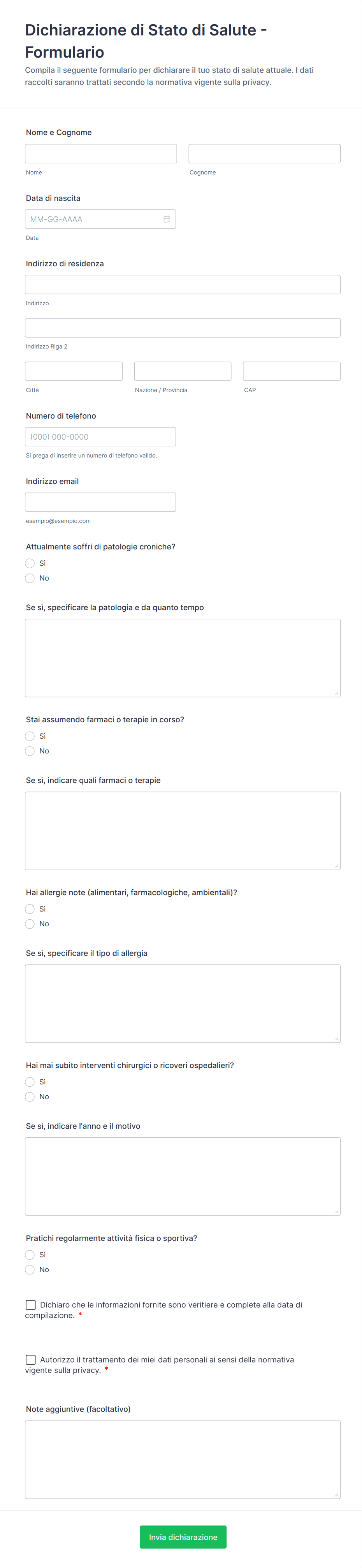 - Dichiarazioni Sanitarie: Possono includere campi per sintomi recenti, cronologia dei viaggi e tracciamento dei contatti.