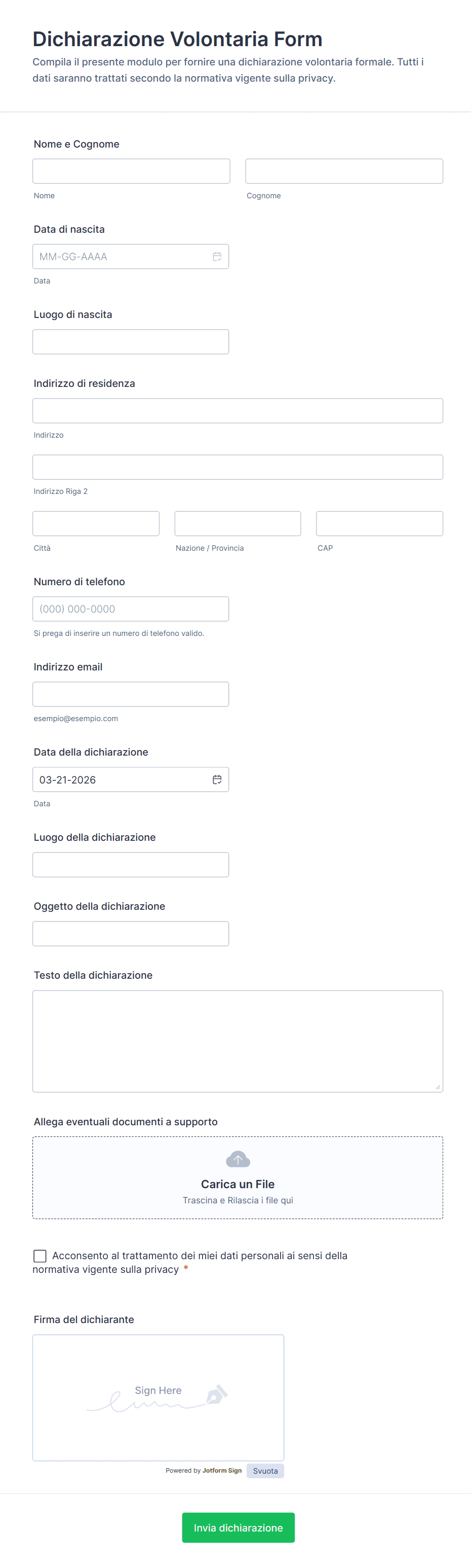 - Dichiarazioni Legali: Richiedono termini dettagliati, caselle di controllo per l'accettazione e campi per la firma elettronica.
