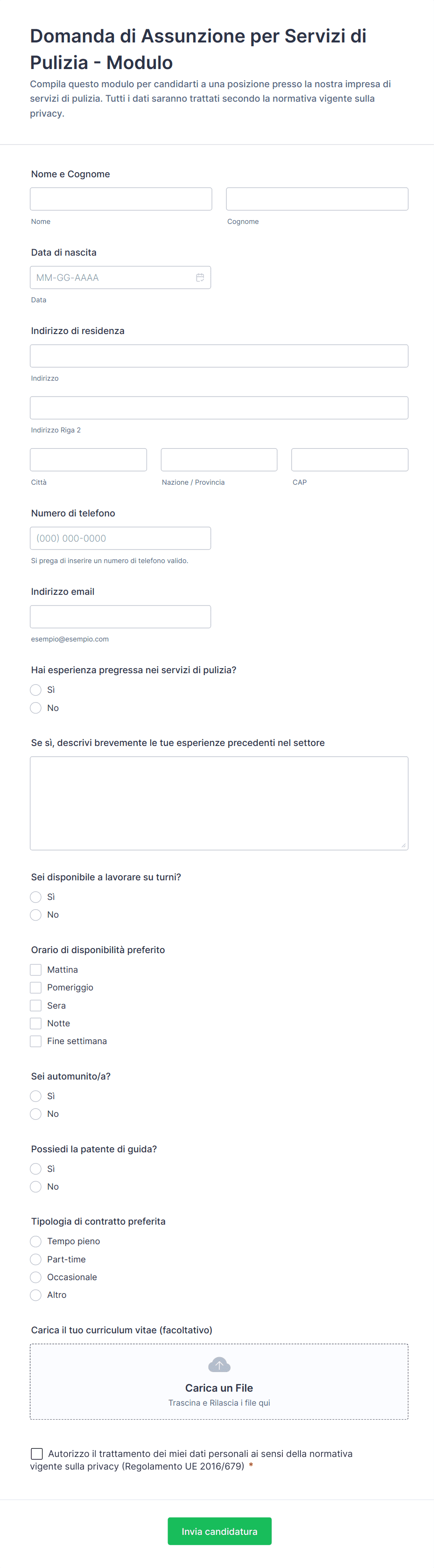 - Per le candidature di lavoro: nome, informazioni di contatto, istruzione, esperienze lavorative, caricamento del curriculum, domande di screening.