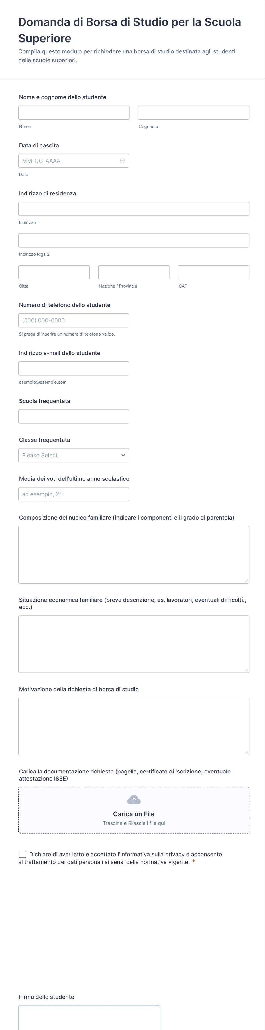 Seguendo questi passaggi, puoi creare un modulo di domanda per borse di studio completo che ottimizza il processo di candidatura, garantisce l'accuratezza dei dati e offre un'esperienza positiva sia per i candidati che per lo staff.