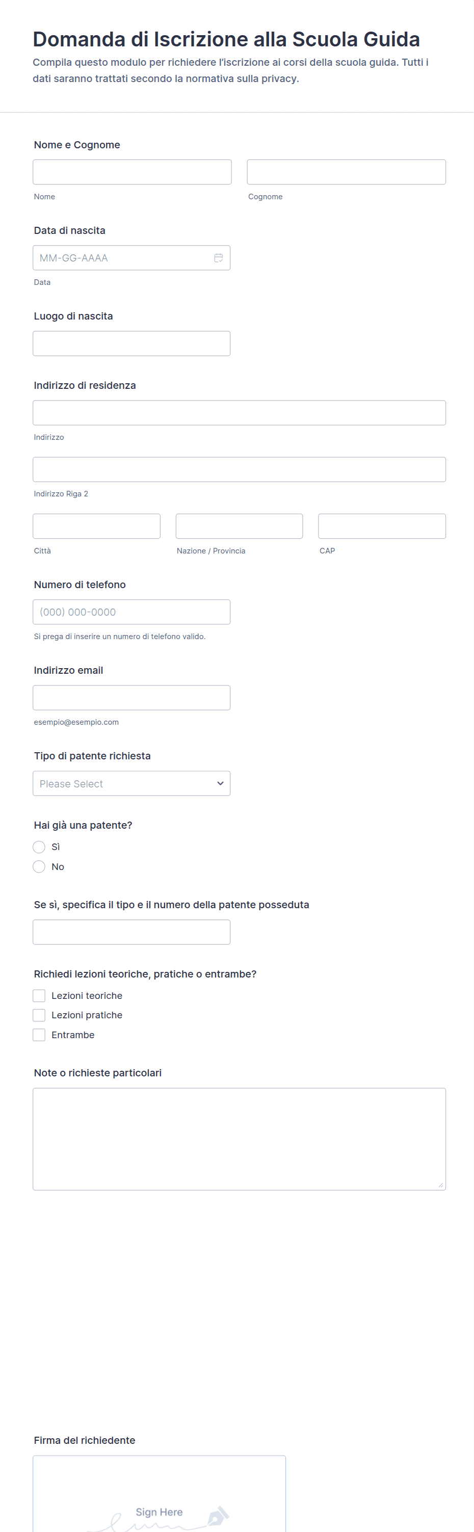 - Ammissioni Scolastiche: I moduli possono richiedere una storia accademica dettagliata, informazioni mediche e il consenso dei genitori.