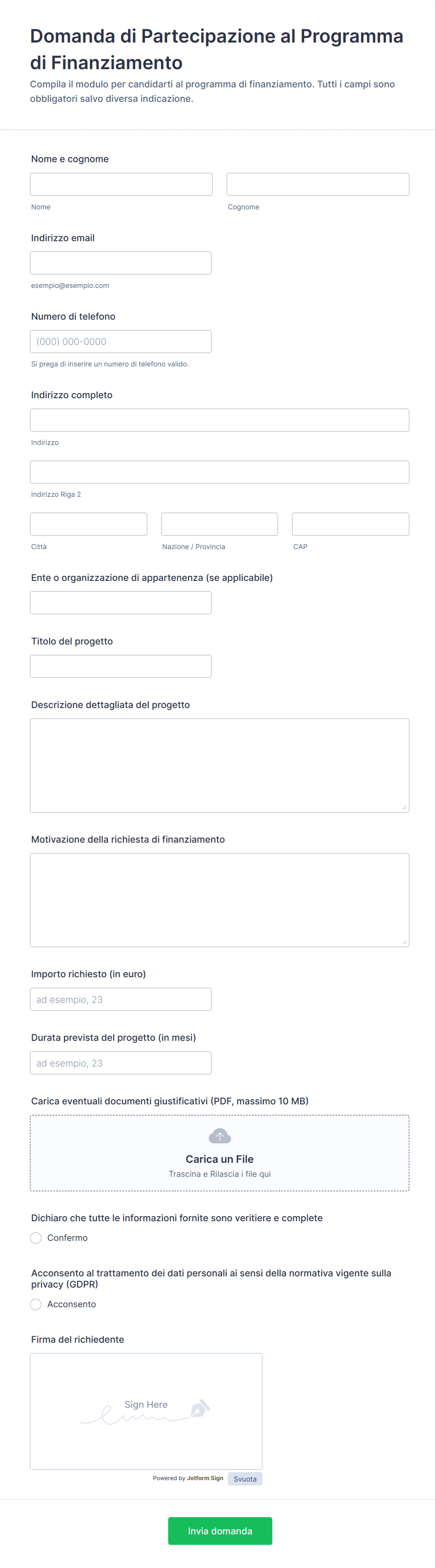 Un Modulo di Richiesta Finanziamento viene utilizzato dagli istituti di credito per decidere se offrire un prestito ad una persona che richiede un finanziamento da un istituto finanziario. Utilizza questo modulo per raccogliere le informazioni necessarie riguardo i richiedenti al fine di decidere se garantire o no il prestito. È sufficiente personalizzare i campi per includere tutte le informazioni necessarie che rimarranno disponibili per essere consultate in un secondo momento. Una volta creato il modulo, è possibile condividerlo con un link o incorporarlo nel proprio sito web. Sara' sufficiente sincronizzarsi con il servizio di archiviazione prescelto per visualizzare tutti gli invii attraverso un'unica piattaforma. Per gli utenti più esperti, è possibile integrare il modulo con Google Drive, Dropbox, Box o con un processore di pagamento di terze parti come Stripe o PayPal, per sfruttare al meglio le informazioni raccolte. Personalizza il tuo Modulo di Richiesta Finanziamento utilizzando questo modello gratuito di Jotform!