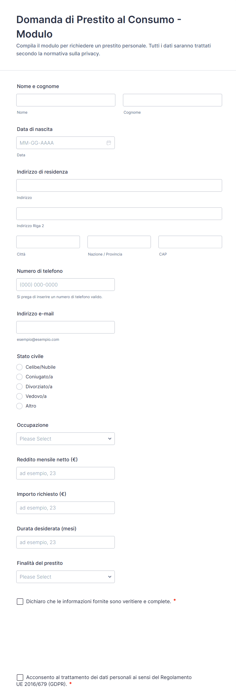 I campi comuni includono i dati personali del richiedente, informazioni su occupazione e reddito, importo e scopo del prestito, garanzie (se applicabili) e consenso per i controlli del credito.