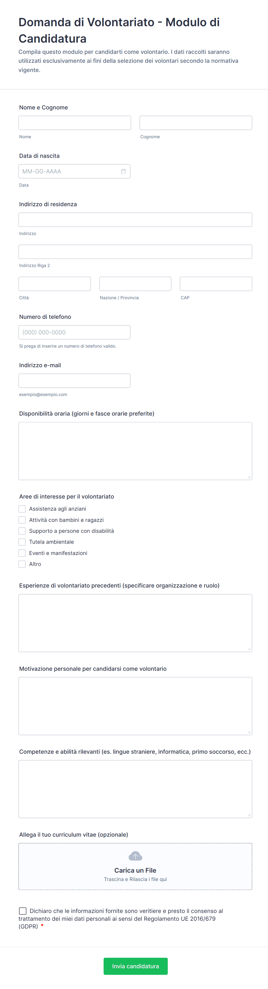 I campi comuni includono nome, informazioni di contatto, disponibilità, aree di interesse, competenze, esperienze precedenti, contatti di emergenza e consenso per verifiche dei precedenti o approvazione dei genitori, se richiesto.