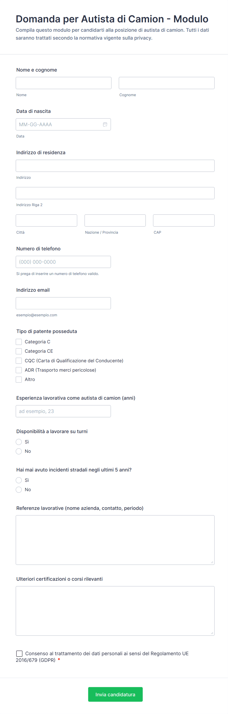 In genere include dati di contatto, dettagli sulla patente, anni di esperienza e informazioni come disponibilità ai turni e referenze, oltre al consenso al trattamento dei dati personali per gestire correttamente la risposta.